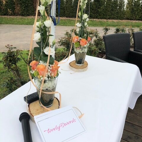 Das Team des Margaretenhof in Schwabenheim sind auf freie Trauungen eingestellt. Es wurden nochmal alle Stühle von den Blütenpollen befreit, bevor die Gäste ankamen. Ein kleiner Tisch mit weißer Tischdecke und Blumengesteck war bereits hergerichtet. Ich wurde dort als Dienstleister von den Mitarbeitern sehr nett empfangen. Es wurde auch sofort gefragt, ob ich denn noch Stromkabel oder entsprechende Verlängerungen brauchen würde. Da ich eine Box mit Akkus habe, wurde das nicht benötigt. Gemeinsam haben wir den Ablauf der freien Trauung besprochen, damit der Sekt dann auch im richtigen Moment bereitsteht. Alles in allem eine runde Sache.